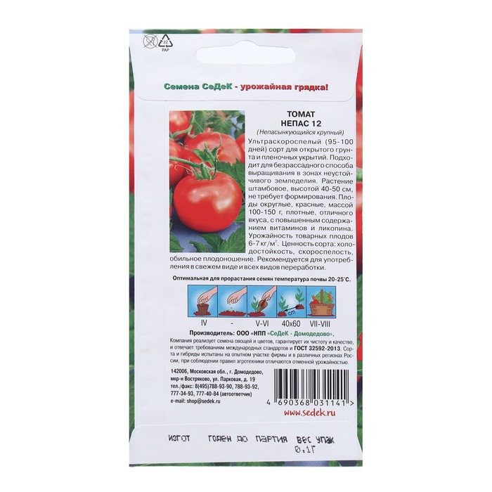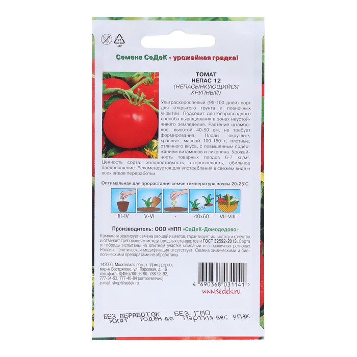 Ультраскороспелый (95-100 дней) сорт для открытого грунта и пленочных укрытий. Подходит для безрассадного способа выращивания в зонах неустойчивого земледелия. Растение штамбовое, высотой 40-50 см, не требует формирования. Плоды округлые, красные, массой 100-150 г, плотные, отличного вкуса, с повышенным содержанием витаминов и ликопина. Урожайность товарных плодов 6-7 кг/м2.