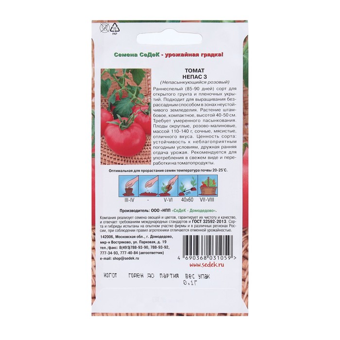 Раннеспелый (85-90 дней) сорт для открытого грунта и пленочных укрытий. Подходит для выращивания безрассадным способом в зонах неустойчивого земледелия. Растение штамбовое, компактное, высотой 40-50 см. Требует умеренного пасынкования. Плоды округлые, розово-малиновые, массой 110-140 г, сочные, мясистые, отличного вкуса. Ценность сорта: устойчивость к неблагоприятным погодным условиям, дружная ранняя отдача урожая. Рекомендуется для употребления в свежем виде и переработки на томатопродукты.
