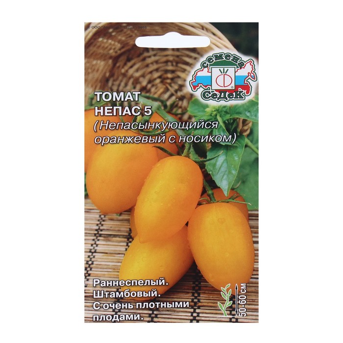 Интересный «солнечный» сорт от компании СеДек, выращивать который легко – томат Непас 5 (непасынкующийся оранжевый с носиком). Купить семена оригинального качества от производителя вы можете в нашем интернет – магазине. Низкорослые штамбовые кустики, высотой не более 60 см, можно высаживать и на открытом участке, и под пленкой – они не займут много места. На вегетацию растению потребуется совсем немного времени – всего около 100-105 суток с момента первых всходов. С благодарностью относится к подкормкам, пасынкования и прищипывания не требует. Главная ценность сорта в высокой урожайности, привлекательности и лежкости плодов. Помидоры среднего размера, около 70 г, имеют яркий оранжевый цвет, вытянутые, со слабо выраженными ребрами и «носиком». Плотная кожица обеспечивает безопасную транспортировку и пригодность к цельноплодной консервации. Их также можно солить, добавлять в салаты.