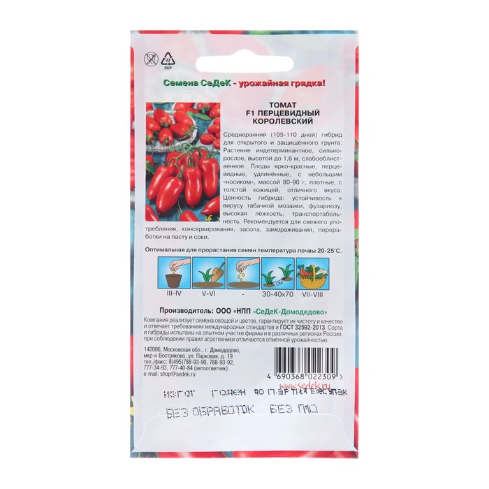 Среднеранний (105-110 дней) гибрид для открытого и защищённого грунта. Растение индетерминантное, сильнорослое, высотой до 1,6 м, слабооблиственное. Плоды ярко-красные, перцевидные, удлинённые, с небольшим «носиком», массой 80-90 г, плотные, с толстой кожицей, отличного вкуса. Ценность сорта: устойчивость к вирусу табачной мозаики, фузариозу, высокая лёжкость, транспортабельность. Рекомендуется для свежего употребления, консервирования, засола, замораживания, переработки на пасту и соки.