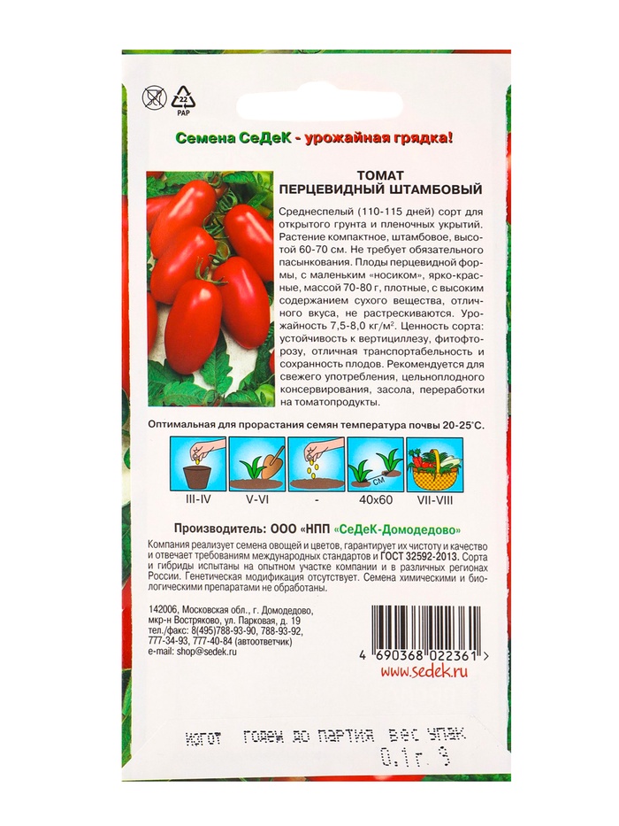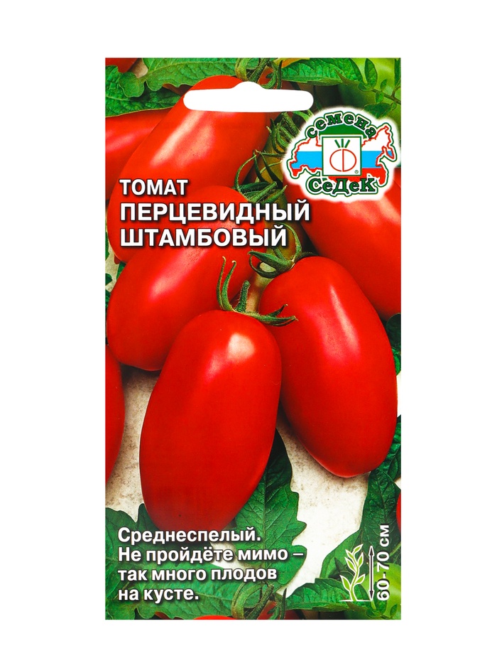 Среднеспелый (110-115 дней) сорт для открытого грунта и пленочных укрытий. Растение компактное, штамбовое, высотой 60-70см. Не требует обязательного пасынкования. Плоды перцевидной формы, с маленьким «носиком», ярко-красные, массой 70-80 г, плотные, с высоким содержанием сухого вещества, отличного вкуса, не растрескиваются. Урожайность 7,5-8,0 кг/м2. Ценность сорта: устойчивость к вертициллезу, фитофторозу, отличная транспортабельность и сохранность плодов. Рекомендуется для свежего употребления, цельноплодного консервирования, засола, переработки на томатопродукты.