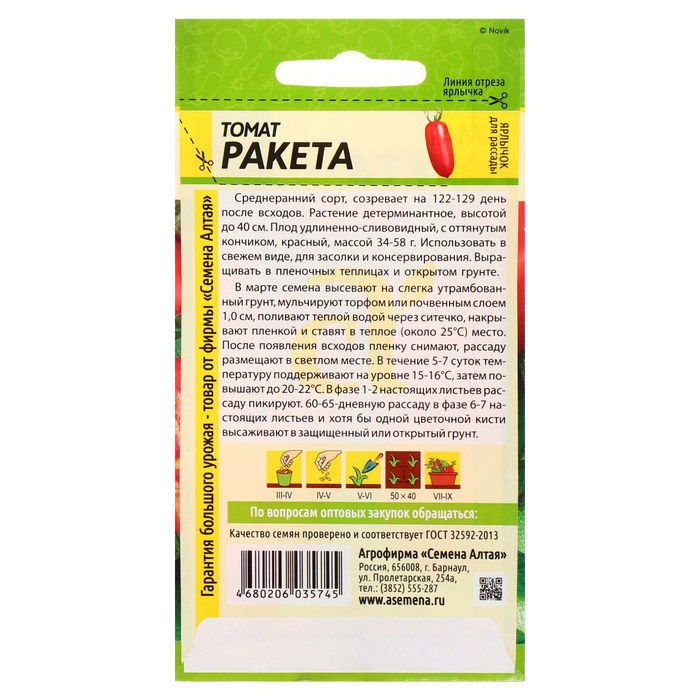 Среднеранний сорт, созревает на 122-129 день после всходов. Растение детерминантное, высотой до 40 см. Плод удлиненно-сливовидный, с оттянутым кончиком, красный, массой 34-58 г. Использовать в свежем виде, для засолки и консервирования. Выращивать в пленочных теплицах и открытом грунте.