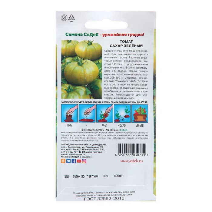 Среднеспелый (110-115 дней) салатный сорт для открытого грунта и пленочных теплиц. Растение индетерминантное, среднерослое, высотой 1,2-1,5 м, с продолжительным плодоношением. В кисти формируется 3-5 плодов. Плоды плоскоокруглые, желтовато-зеленые, массой 200-300 г, мясистые, сочные, сладкие. Урожайность 6-7 кг/м2. Ценность сорта: один из лучших салатных сортов, обладающий высокими лечебными и диетическими свойствами. Рекомендуется для употребления в свежем виде.