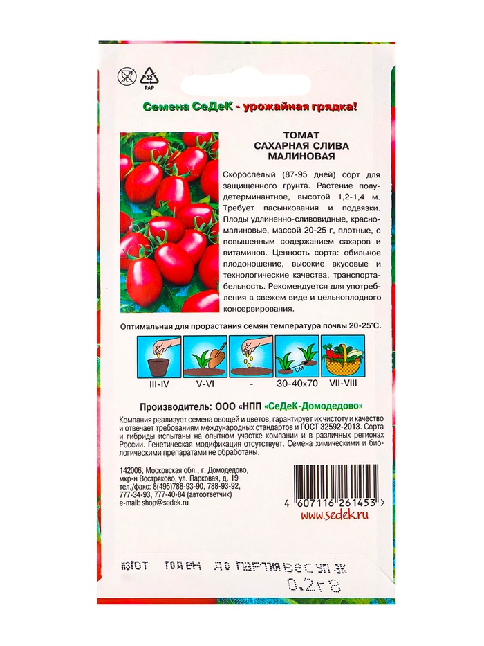 Скороспелый (87-95 дней) сорт для защищенного грунта. Растение полудетерминантное, высотой 1,2-1,4 м. Требует пасынкования и подвязки. Плоды удлиненно-сливовидные, красно-малиновые, массой 20-25 г, плотные, с повышенным содержанием сахаров и витаминов. Ценность сорта: обильное плодоношение, высокие вкусовые и технологические качества, транспортабельность. Рекомендуется для употребления в свежем виде и цельноплодного консервирования.