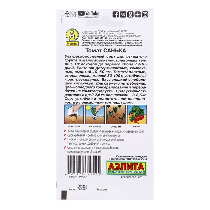 Ультраскороспелый сорт для открытого грунта и малогабаритных пленочных теплиц. От всходов до первого сбора 79-85 дней. Растения детерминантные, компактные, высотой 40-60 см. Томаты плотные, выровненные, массой 80-100 г, устойчивые к растрескиванию. Вкус сладкий с небольшой кислинкой.