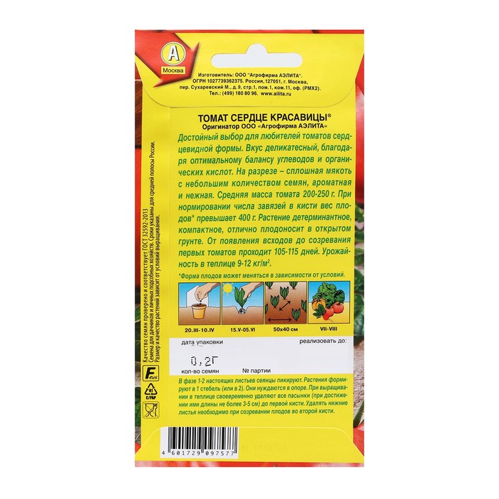 Ранний сорт для открытого грунта и теплиц, вступает в плодоношение спустя 100-110 дней от полных всходов. Формирует детерминантные растения высотой 70-100 см с нарядными сердцевидными плодами. Первое соцветие закладывается над 8-м листом, последующие – через 1-2 листа. Томаты очень крупные – средней массой 200-250 г (первые плоды до 350 г), ребристые у плодоножки. Окраска незрелого плода – светло-зелёная с темным пятном у основания, зрелого – оранжево-красная. Вкусовые качества и аромат плодов превосходные. Средняя урожайность 9-10 кг/м2. Ценность сорта – раннеспелость, крупноплодность, высокая урожайность и красивая форма плодов. Для свежего потребления и переработки на сок.