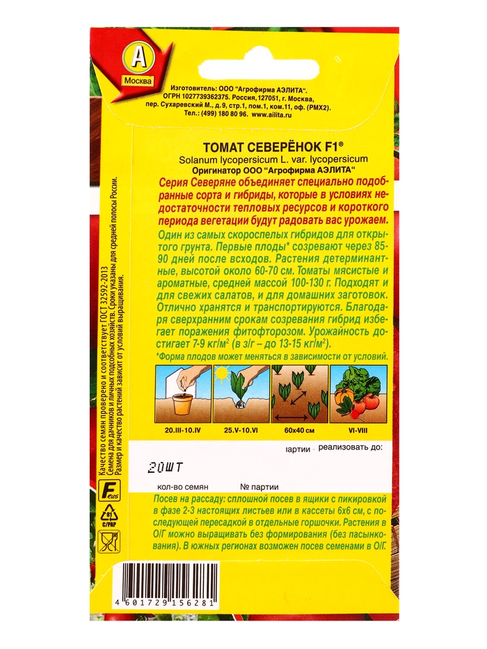 Посев: на рассаду в 3 декаде марта. Пикируйте в фазе 1–2 настоящих листьев. Помещайте сеянцы в середине мая под плёнку, а в начале июня — в открытый грунт. Возраст рассады составляет 60–65 дней в фазе 5–7 настоящих листьев. Схема посадки — 50 × 40 см.