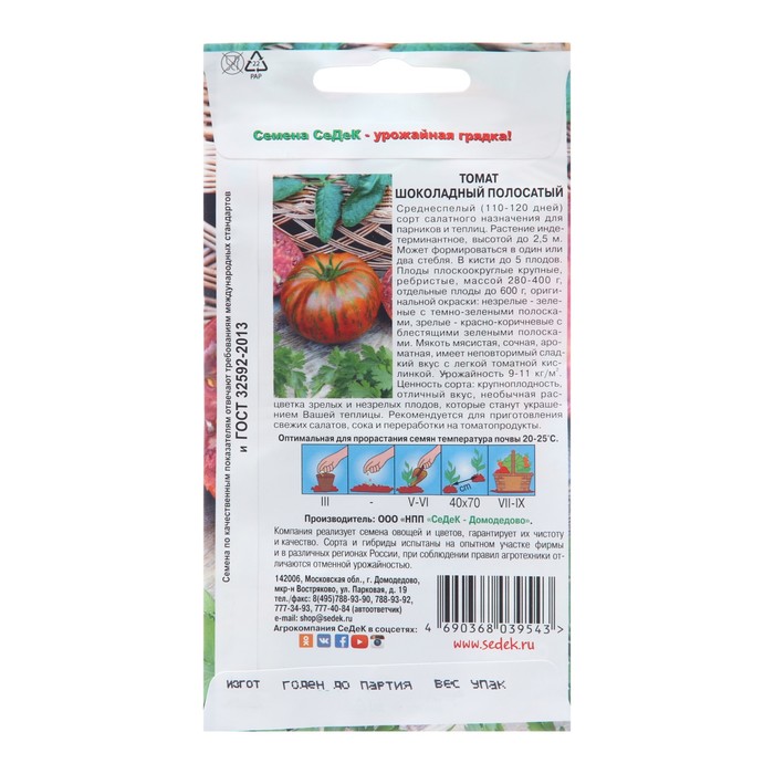 Среднеспелый (110-120 дней) сорт салатного назначения для парников и теплиц. Растение индетерминантное, высотой до 2,5 м. Может формироваться в один или два стебля. В кисти до 5 плодов. Плоды плоскоокруглые крупные, ребристые, массой 280-400 г, отдельные плоды до 600 г, оригинальной окраски: незрелые - зеленые с темно-зелеными полосками, зрелые - красно-коричневые с блестящими зелеными полосками. Мякоть мясистая, сочная, ароматная, имеет неповторимый сладкий вкус с легкой томатной кислинкой. Урожайность 9-11 кг/м2. Ценность сорта: крупноплодность, отличный вкус, необычная расцветка зрелых и незрелых плодов, которые станут украшением Вашей теплицы. Рекомендуется для приготовления свежих салатов, сока и переработки на томатопродукты.