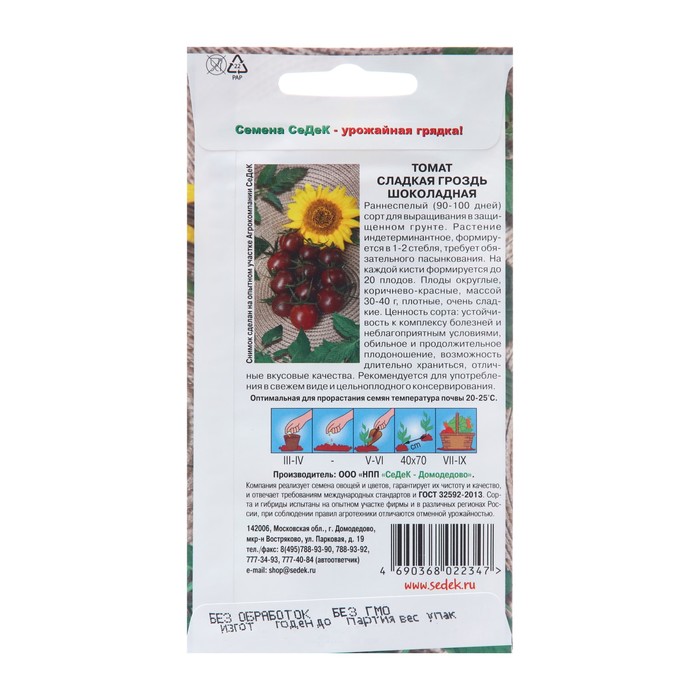 Раннеспелый (90-100 дней) сорт для выращивания в защищенном грунте. Растение индетерминантное, формируется в 1-2 стебля, требует обязательного пасынкования. На каждой кисти формируется до 20 плодов. Плоды округлые, коричнево-красные, массой 30-40 г, плотные, очень сладкие. Ценность сорта: устойчивость к комплексу болезней и неблагоприятным условиями, обильное и продолжительное плодоношение, возможность длительно храниться, отличные вкусовые качества. Рекомендуется для употребления в свежем виде и цельноплодного консервирования.