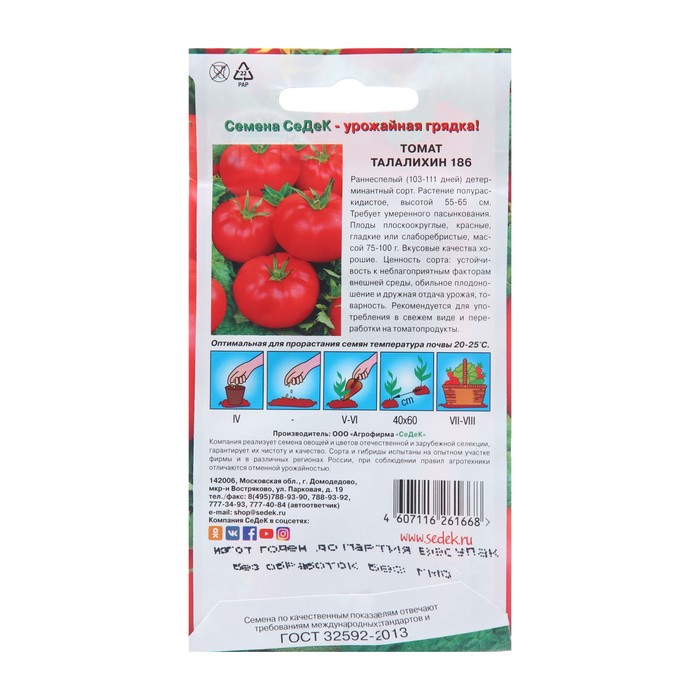 Раннеспелый (103-111 дней) детерминантный сорт. Растение полураскидистое, высотой 35-65 см. Требует умеренного пасынкования. Плоды плоскоокруглые, красные, гладкие или слаборебристые, массой 75-100 г. Вкусовые качества хорошие. Ценность сорта: устойчивость к неблагоприятным факторам внешней среды, обильное плодоношение и дружная отдача урожая, товарность. Рекомендуется для употребления в свежем виде и переработки на томатопродукты.