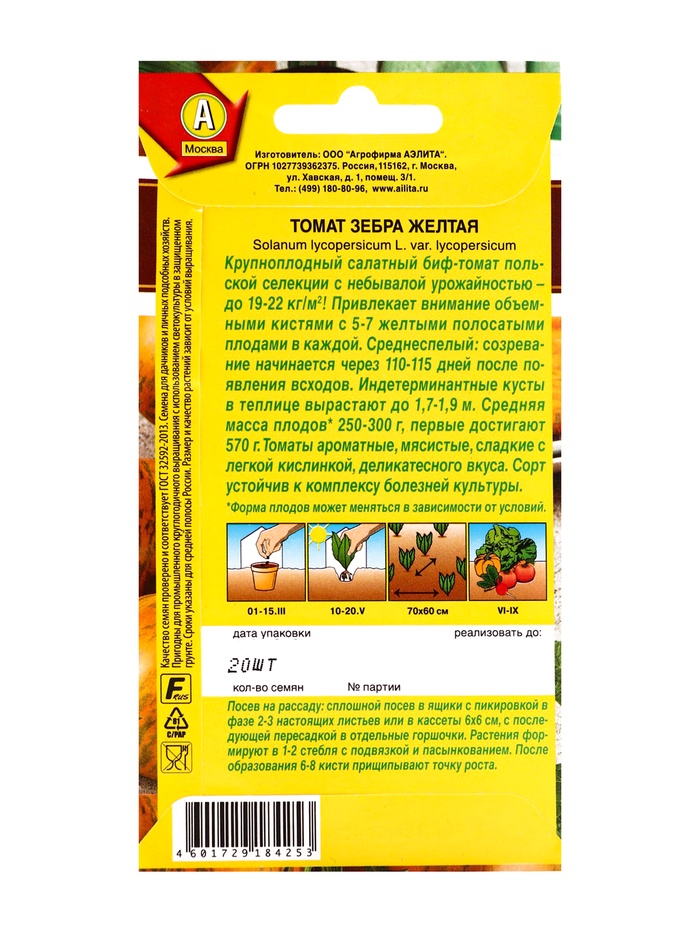 Крупноплодный, салатный биф-томат польской селекции с небывалой урожайностью – до 19-22 кг/м2! Привлекает внимание объемными кистями с 5-7 желтыми полосатыми плодами в каждой. Среднеспелый: созревание начинается через 110-115 дней после появления всходов. Индетерминантные кусты в теплице вырастают до 1,7-1,9 м. Средняя масса плодов 250-300 г, первые достигают 570 г. Томаты ароматные, мясистые, сладкие с легкой кислинкой, деликатесного вкуса. Сорт устойчив к комплексу болезней культуры.