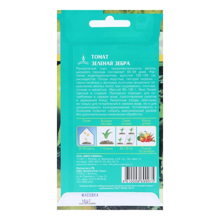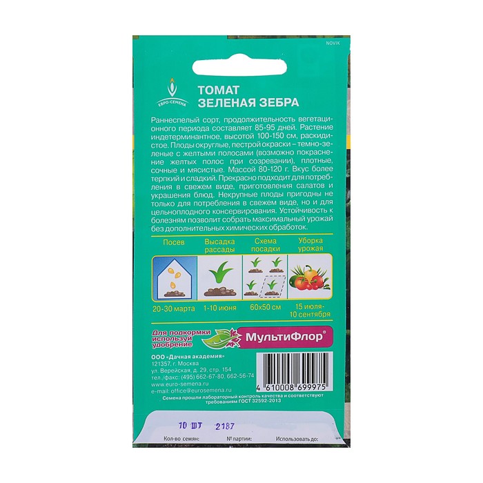Раннеспелый сорт, продолжительность вегетационного периода составляет 85-95 дней. Растение индетерминантное, высотой 100-150 см, раскидистое. Плоды округлые, пестрой окраски - темно-зеленые с желтыми полосами (возможно покраснение желтых полос при созревании), плотные, сочные и мясистые. Массой 80-120 г. Вкус более терпкий и сладкий. Прекрасно подходит для потребления в свежем виде, приготовления салатов и украшения блюд. Некрупные плоды, пригодны не только для потребления в свежем виде, но и для цельноплодного консервирования. Устойчивость к болезням позволит собрать максимальный урожай без дополнительных химических обработок.