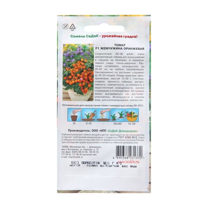 короспелый (85-90 дней) очень декоративный сорт для выращивания в горшках на балконах, в комнатах, зимних садах, патио-двориках. Растение штамбовое, низкорослое, до 20-30 см, не требует пасынкования. Одновременно на растении созревает до 30-35 плодов. Плоды округлые ярко-оранжевые, массой 15-20 г, плотные, сладкие. Ценность сорта: декоративность, компактность, устойчивость к недостаточной освещенности, раннее созревание и отличный вкус. На грядках может высаживаться как растение-уплотнитель. Используется в свежем виде, для консервирования, заморозки.
