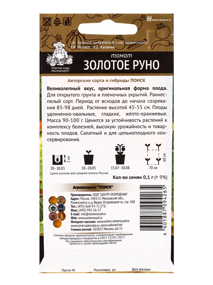 Семена томатов «Золотое руно» относятся к раннеспелому сорту, предназначенному для открытого грунта и плёночных теплиц. Период от всходов до начала созревания составляет 85‒98 дней.