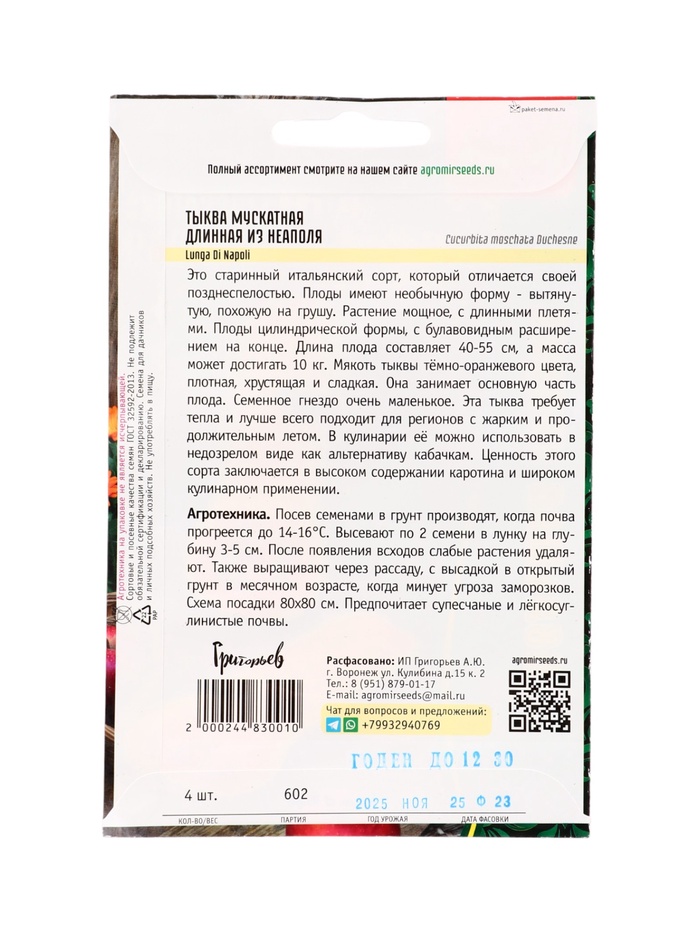 Семена Тыква Длинная из Неаполя мускатная (Lunga Di Napoli) 4 шт. / НОВИНКА 12.29 г.