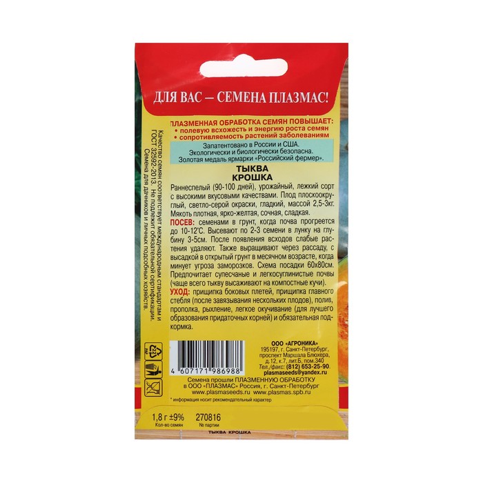Плод плоскоокруглый, гладкий, массой 2,5-3,0 кг. Окраска плода светло-серая с бледно-розовыми пятнами. Мякоть ярко-оранжевая, толстая, плотная, сладкая, малосочная. Ценность сорта:стабильная урожайность, выравненность плодов, отличные вкусовые качества, хорошая лежкость, устойчивость к болезням.