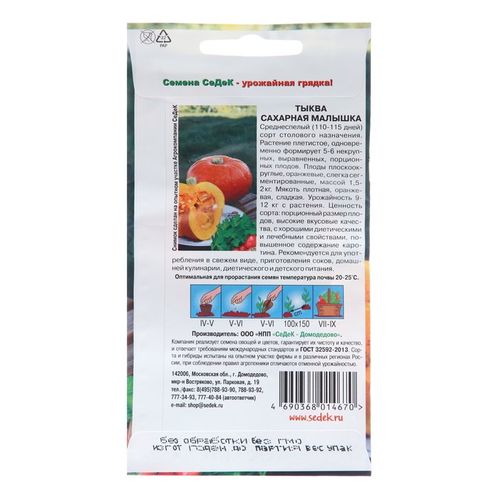 Среднеспелый (110-115 дней) гибрид столового назначения. Растение плетистое, одновременно формирует 5-6 некрупных, выравненных, порционных плодов. Плоды плоскоокруглые, оранжевые, слегка сегментированные, массой 1,5-2 кг. Мякоть плотная, оранжевая, сладкая. Урожайность 9-12 кг с растения. Ценность гибрида: порционный размер плодов, высокие вкусовые качества, с хорошими диетическими и лечебными свойствами, повышенное содержание каротина. Рекомендуется для употребления в свежем виде, приготовления соков, домашней кулинарии, диетического и детского питания.