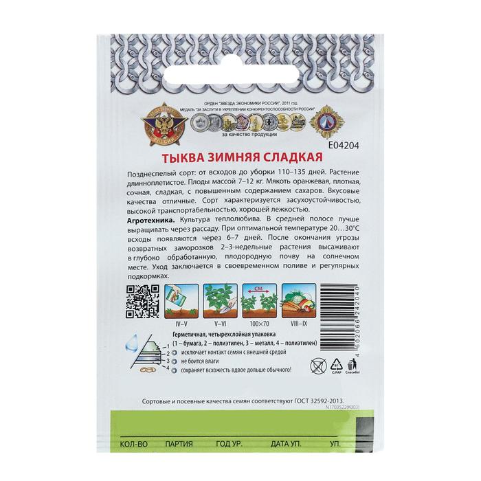 «Зимняя сладкая» — высокоурожайный позднеспелый сорт универсального назначения (от всходов до созревания проходит 120–130 дней). Растение среднеплетистое. Плоды плоскоокруглые, сегментированные, массой 7–12 кг. Окраска фона тёмно-серая с рисунком в виде мелких светло-серых пятен различной интенсивности. Мякоть оранжевая, толстая, плотная, ароматная, с повышенным содержанием сахаров. Рекомендуется для потребления в свежем виде, консервирования и хранения. Сорт ценится за высокие вкусовые качества, хорошую лёжкость, транспортабельность и устойчивость к болезням.