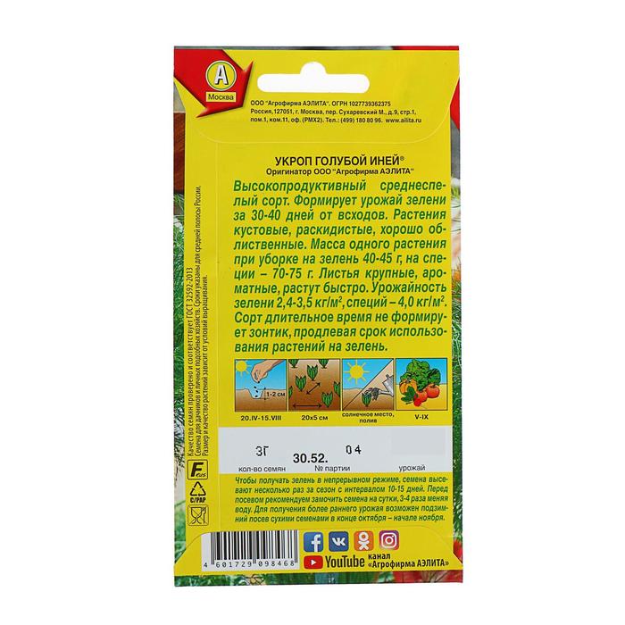 «Голубой иней» — высокоурожайный среднеспелый сорт укропа. Растение формирует крупные ароматные листья. Используется для сушки, заморозки и употребления в свежем виде. Отличается быстрым ростом и холодостойкостью.