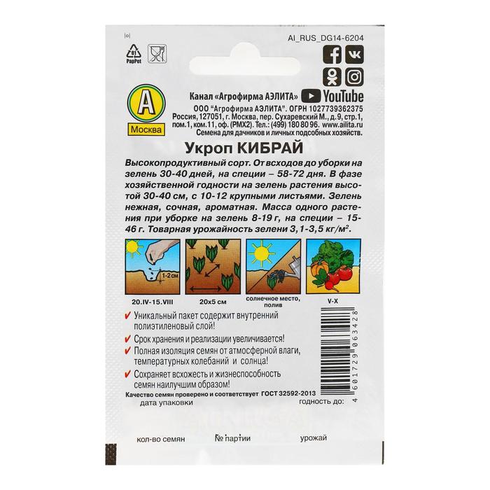 «Кибрай» — это позднеспелый сорт укропа, у которого период от массовых всходов до уборки урожая составляет 40–50 дней, а на специи 55–70 дней. Благодаря высокой устойчивости к стеблеванию продолжительное время сохраняет хозяйственную годность.