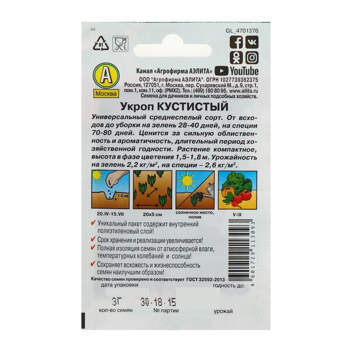 Благодаря внутреннему полиэтиленовому слою пакет не пропускает влагу и увеличивает срок годности семян до 2 лет.