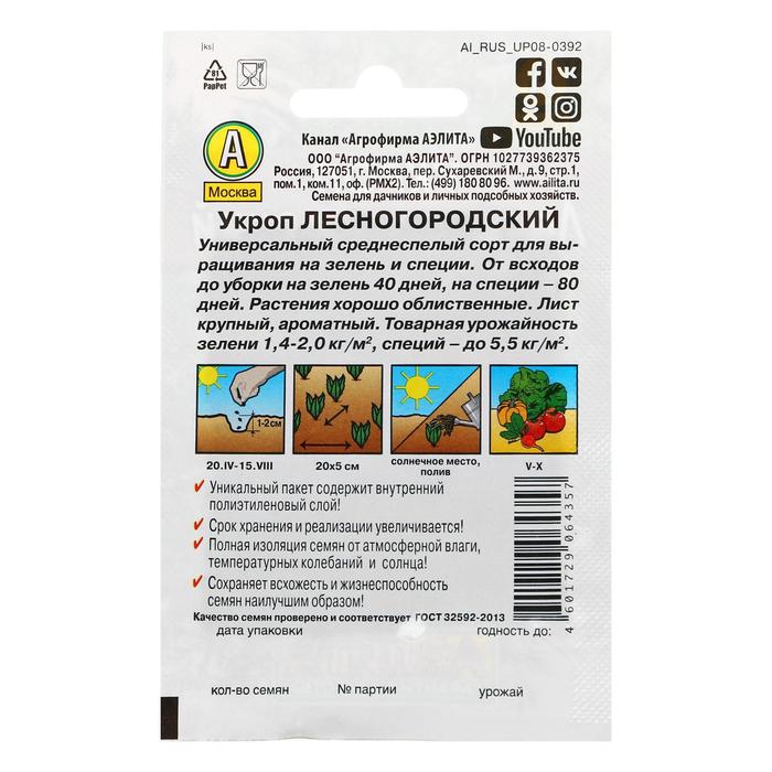 «Лесногородский» — это среднеспелый сорт укропа, у которого период от массовых всходов до уборки урожая составляет 70–80 дней. Урожайность зелени составляет 1,4–2 кг/м², а специй — до 5,5 кг/м².