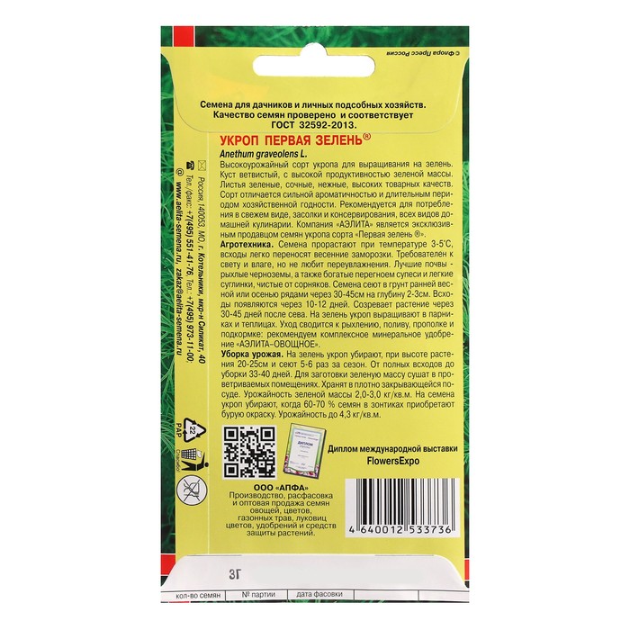 Укроп для многоразового сбора, отличается ранним сроком созревания (40-45 день). Зелёная масса богатая, растения кустистые, ветвистые, стебель и листья нежные, сочные. Срезанный укроп долго сохраняет свежесть, вкус и аромат. Используют зелень преимущественно в свежем виде, для украшения блюд, в качестве пряной приправы. Сорт также годится для засолки и маринада. Из почв любит рыхлый чернозём, даёт неплохой урожай на лёгких супесях и суглинках. Не терпит переувлажнения. Заморозки переносит легко: этот сорт без опасений можно высаживать ранней весной.