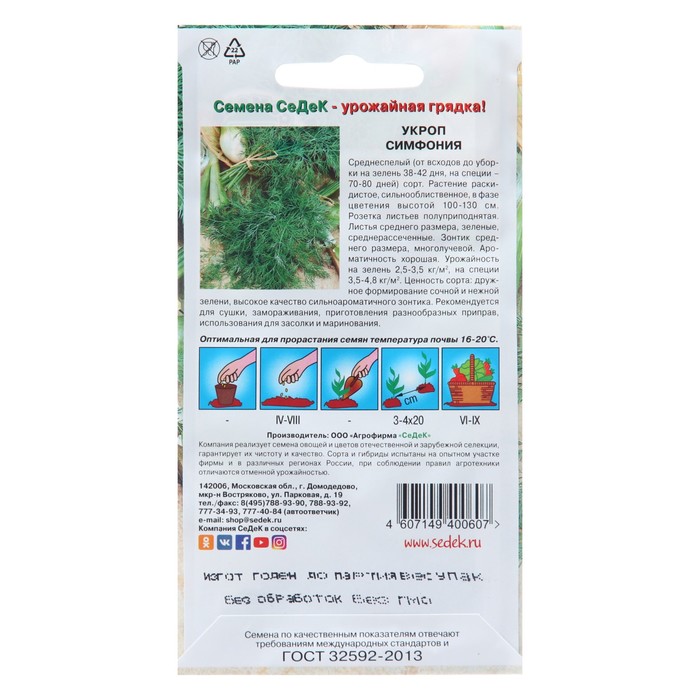 Среднеспелый (от всходов до уборки на зелень 38-42 дня, на специи – 70-80 дней) сорт. Растение раскидистое, сильнооблиственное, в фазе цветения высотой 100-130 см. Розетка листьев полуприподнятая. Листья среднего размера, зеленые, средне рассеченные. Ароматичность хорошая. Урожайность на зелень 2,5-3,5 кг/м2. Ценность сорта: дружное формирование сочной и нежной зелени, высокое качество сильно ароматичного зонтика. Рекомендуется для сушки, замораживания, приготовления разнообразных приправ, засолки и маринования.