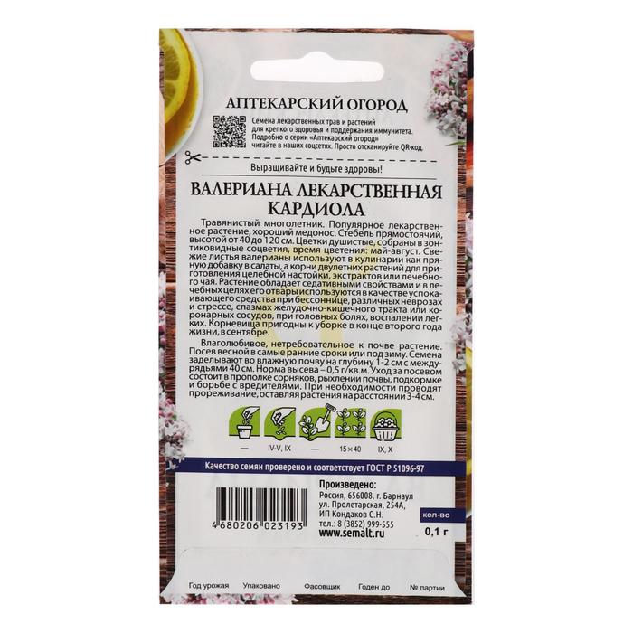 Растение обладает седативными свойствами и в лечебных целях его отвары используются в качестве успокаивающего средства при бессоннице, различных неврозах и стрессе, спазмах желудочно-кишечного тракта или коронарных сосудов, при головных болях, воспалении легких. Корневища пригодны к уборке в конце второго года жизни, в сентябре. Влаголюбивое, не требовательное к почве растение. Посев весной в самые ранние сроки или под зиму. Семена заделывают во влажную почву на глубину 1-2 см с междурядьями 40 см. Норма высева —0,5 г/кв.м. Уход за посевом состоит в прополке сорняков, рыхлении почвы, подкормке и борьбе с вредителями.