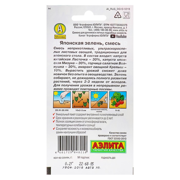 В состав смеси входят семена следующих культур: китайской капусты «Ласточка», японской капусты «Мизуна», сарептской горчицы «Волнушка», овощного амаранта «Крепыш». Все овощи сравнительно новые для нашего стола, но их популярность стремительно растёт. Этому способствует ценный биохимический состав, низкая калорийность, приятный вкус с лёгкой пикантной остротой и отличная сочетаемость с традиционными салатными культурами. Несложная агротехника позволит вырастить хороший урожай даже новичку в овощеводстве.