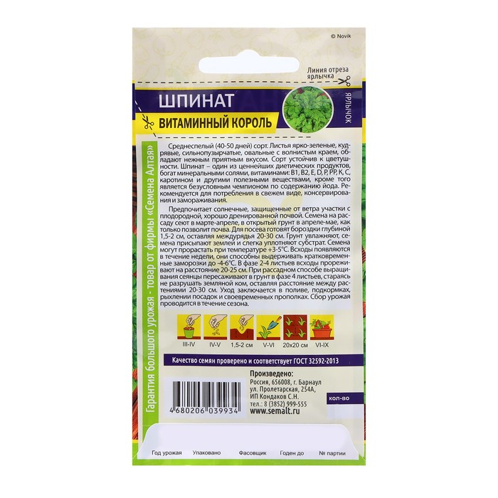 Среднеспелый (40-50 дней) сорт. Листья ярко-зеленые, кудрявые, сильнопузырчатые, овальные с волнистым краем, обладают нежным приятным вкусом. Сорт устойчив к цветушности. Шпинат – один из ценнейших диетических продуктов, богат минеральными солями, витаминами: В1, В2, Е, D, Р, PP, К, С, каротином, и другими полезными веществами, кроме того является безусловным чемпион по содержанию йода. Рекомендуется для потребления в свежем виде, консервирования и для замораживания.
