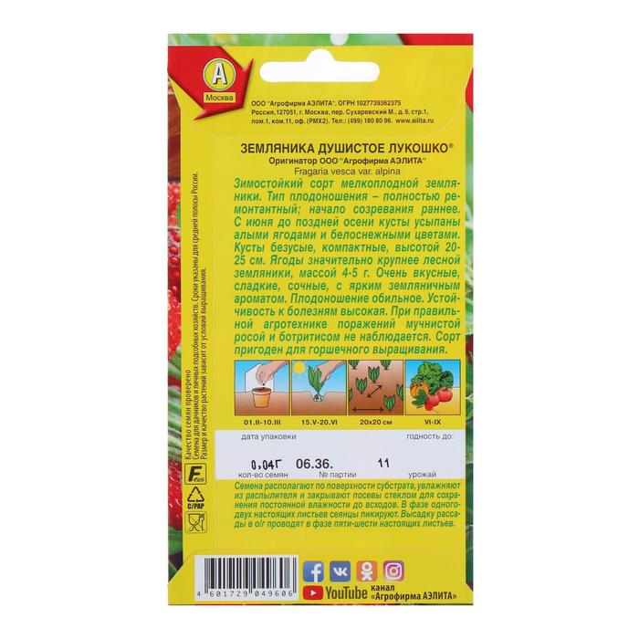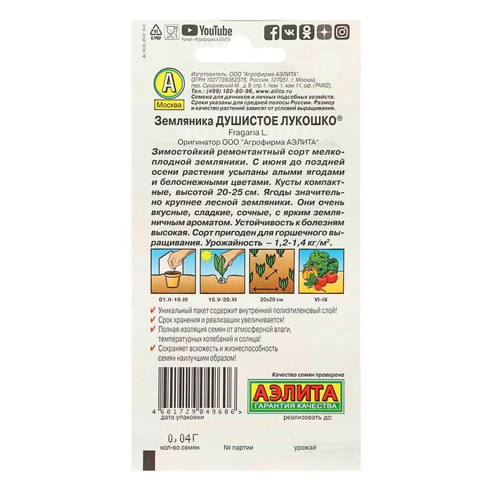 Земляника Душистое лукошко — раннеспелый ремонтантный сорт универсального использования. Куст сильнорослый полушаровидный, усов не образует, размножается семенами. Растение зимостойкое, засухоустойчивость и жаростойкость средние.
