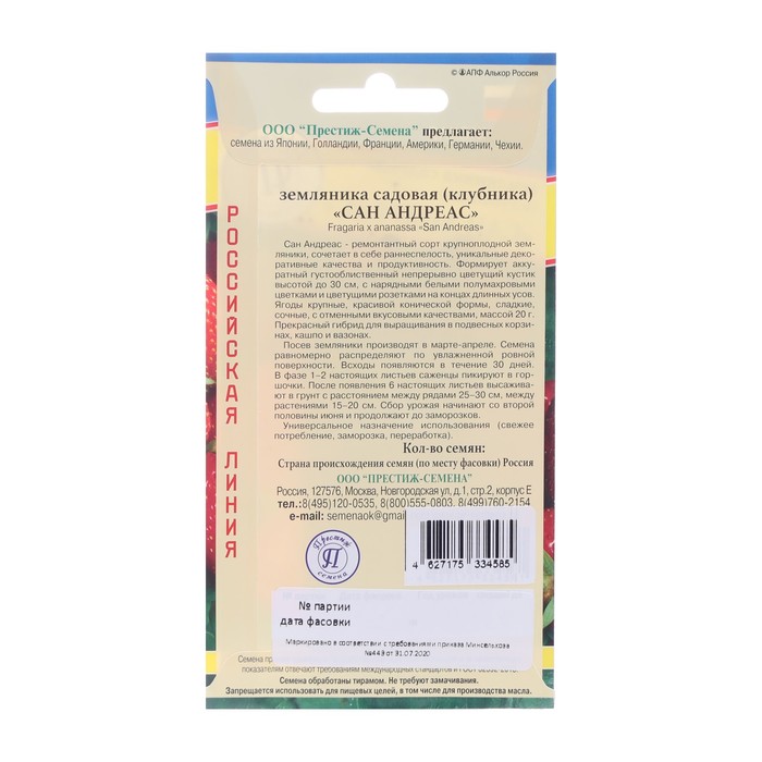 Посев земляники производят в марте-апреле. Семена равномерно распределяют по увлажненной ровной поверхности. Всходы появляются в течении 30 дней. В фазе 1-2 настоящих листьев саженцы пикируют в горшочки. После появления 6 настоящих листьев высаживают в грунт с расстоянием между рядами 25-30см, между растениями 15-20см. Сбор урожая начинают со второй половины июня и продолжают до заморозков.