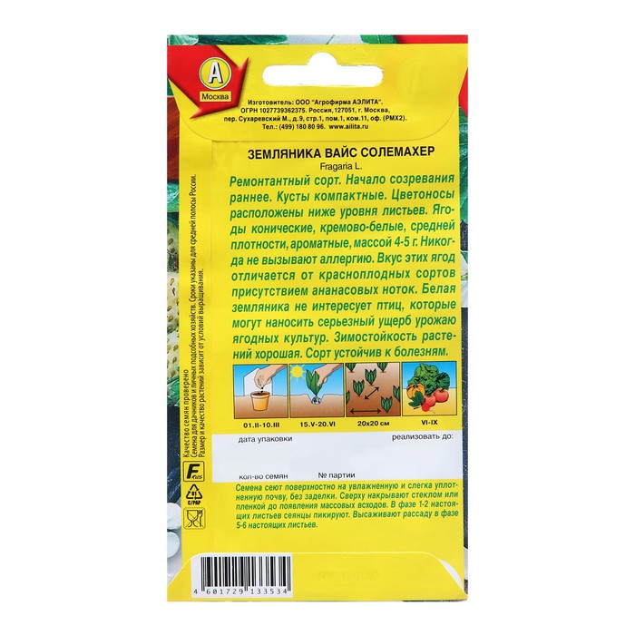"Ремонтантный, безусый сорт. Кусты компактные, полушаровидной формы. Цветоносы расположены ниже уровня листьев. Ягоды средней плотности, ароматные, вкусные, массой 4-5 г. Начало созревания раннее. Зимостойкость растений хорошая.