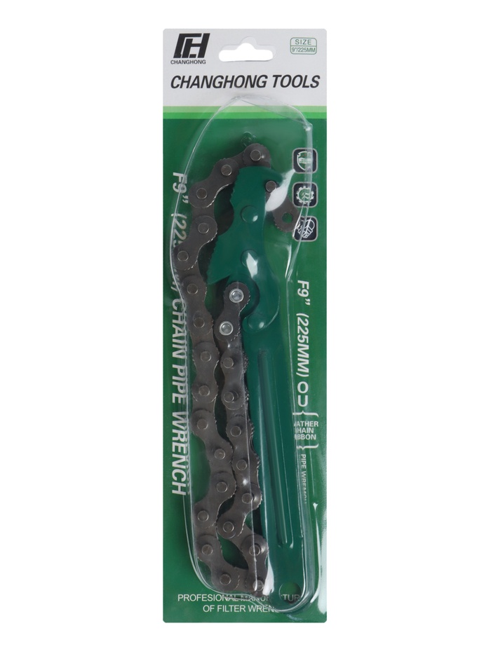 Перед использованием убедитесь, что двигатель остыл и корпус фильтра не слишком горячий. Расположите цепной захват вокруг корпуса фильтра, отрегулируйте длину цепи под необходимый диаметр и надёжно зафиксируйте её. Подсоедините гаечный ключ или трещотку к креплению и аккуратно откручивайте фильтр, равномерно прикладывая усилие. При затруднении движения масла можно немного прогреть двигатель, чтобы ослабить фильтр перед демонтажем.