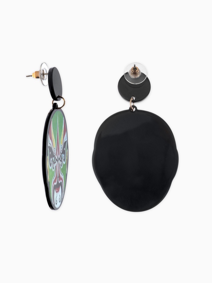 Яркие серьги с изображением традиционной китайской маски — это гармоничное сочетание этнического колорита и современного дизайна. Акриловые вставки в насыщенной разноцветной палитре придают украшению живость и выразительность, а золотистая металлическая основа добавляет элегантности и изящества.
