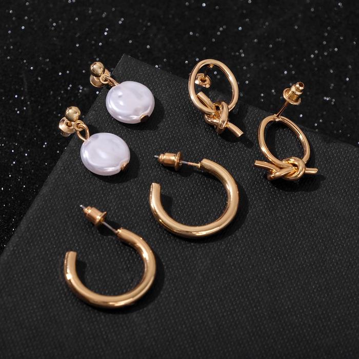 Серьги набор 3 пары «Юность» узел с жемчугом, цвет белый в золоте, d=2,3