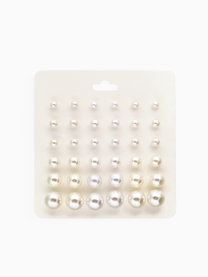 Набор из восемнадцати пар пусет с жемчужными бусинами разного диаметра от 5 до 12 мм — воплощение элегантности и универсальности. Молочно-белый цвет вставок в сочетании с серебристой металлической основой создаёт мягкий, изысканный образ, который легко адаптируется к любому стилю и возрасту.