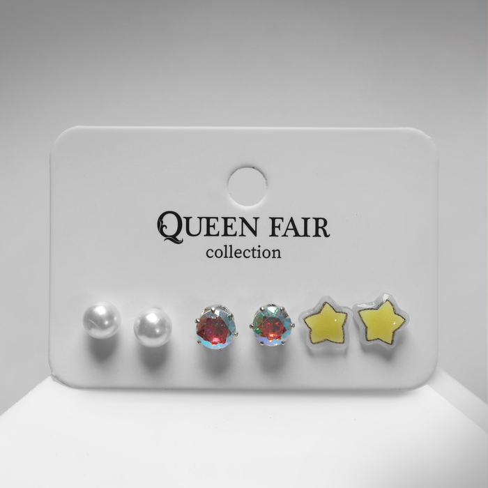 Серьги пусеты QF «Летние истории», 3 пары, звёзды, цвет жёлто-белый в серебре