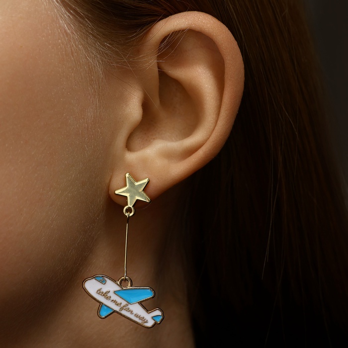 Серьги с изображением самолёта и земного шара — это воплощение мечты о путешествиях и открытии новых горизонтов. Яркие голубые оттенки эмали на золотистом металлическом основании создают живую и динамичную композицию, которая не оставит равнодушной ни одну поклонницу стильных аксессуаров.