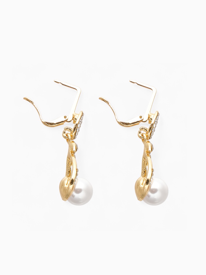 Серьги длиной 4 см с изящным рисунком листьев и тонкими линиями в золотом цвете создают утончённый образ, вдохновлённый природной красотой. Белые вставки из пластика, имитирующие жемчуг, и мерцающие стразы придают украшению лёгкость и сияние, подчёркивая женственность и элегантность.
