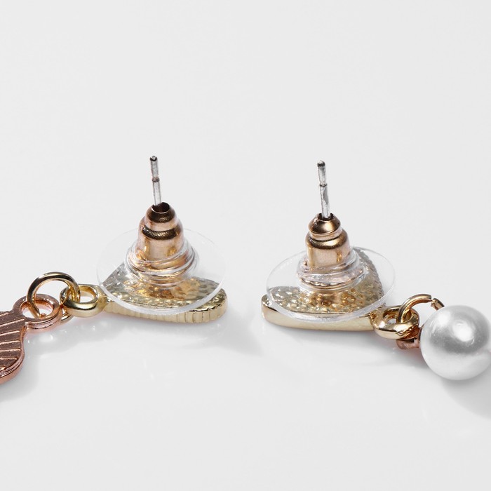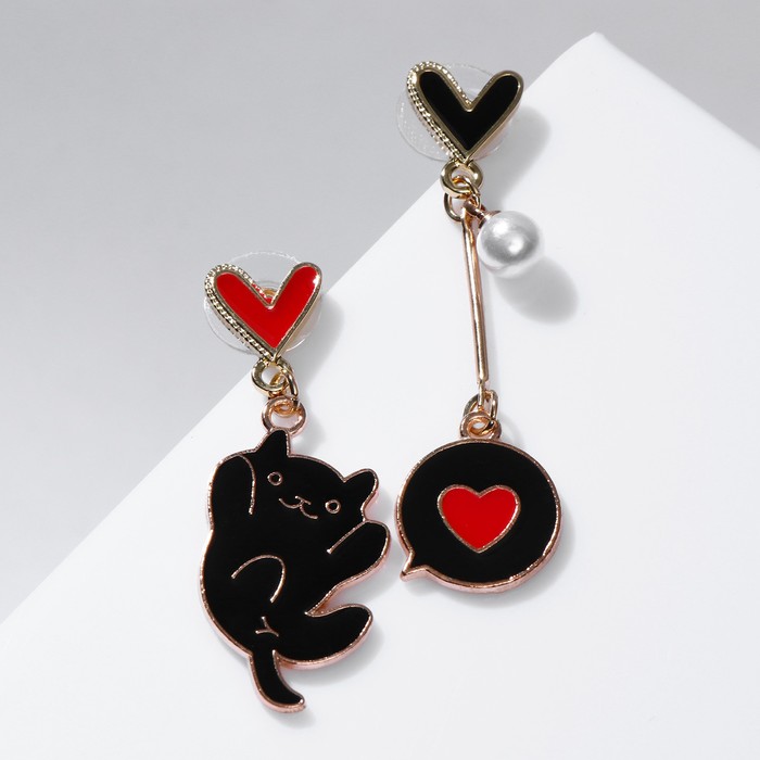 Серьги с жемчугом "Котик" с сердечками, цвет чёрно-красный в золоте