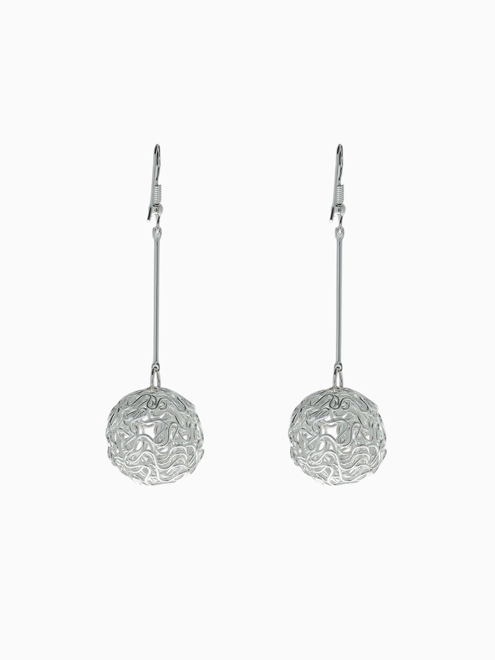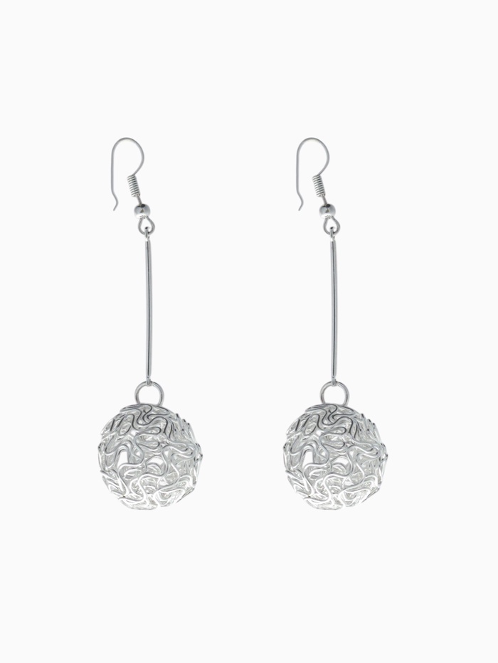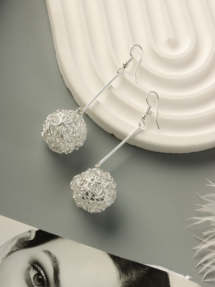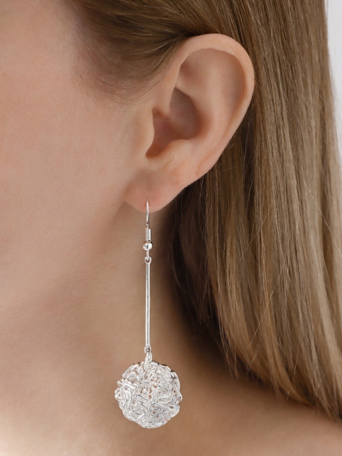 Стильные серьги длиной 6,5 см с изящным переплетением в форме шарика — воплощение современного минимализма и утончённой абстракции. Серебристый металлический блеск придаёт образу лёгкость и свежесть, а оригинальный дизайн добавляет динамику и выразительность.