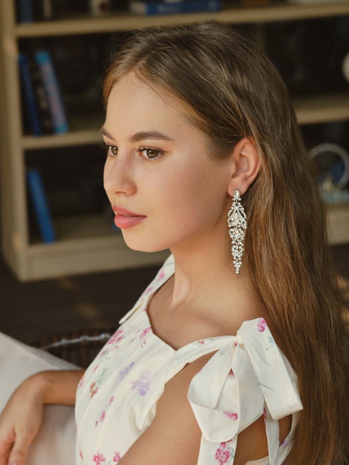 Серьги висячие со стразами «Ажур» лёд, белые в серебре, 8.3 см