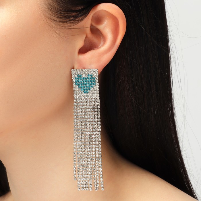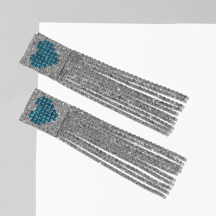 Серьги висячие со стразами «Грация» сердца в квадрате, серебристо-голубые в серебре, 9.5 см