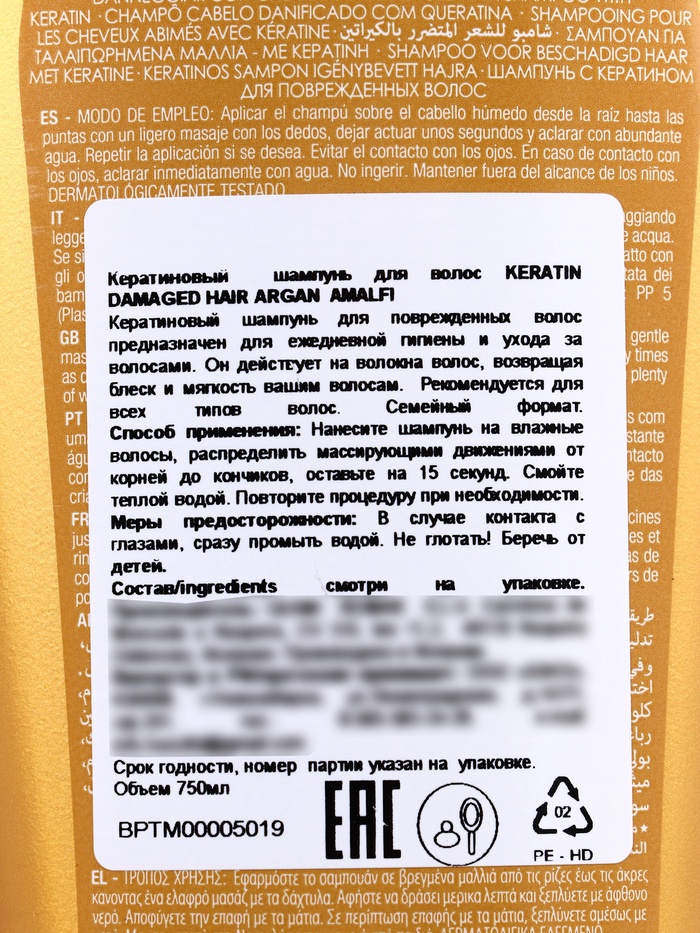 Вода, лаурет сульфат натрия, хлорид натрия, кокамид ДЭА, кокамидопропилбетаин, ПЭГ-5 кокомония метосульфат, ароматизатор, поликватерний-7, лимонная кислота, нитрат магния, пропиленгликоль, бензоат натрия, метилхлоризотиазолинон, хлорид магния, ПЭГ-40 гидрогенизированное касторовое масло, тридецет-9, метилизотиазолинон, аргановое масло, сорбат калия, синтетический краситель тартразин (Cl 19140), краситель желтый "солнечный закат" (Cl 15985)