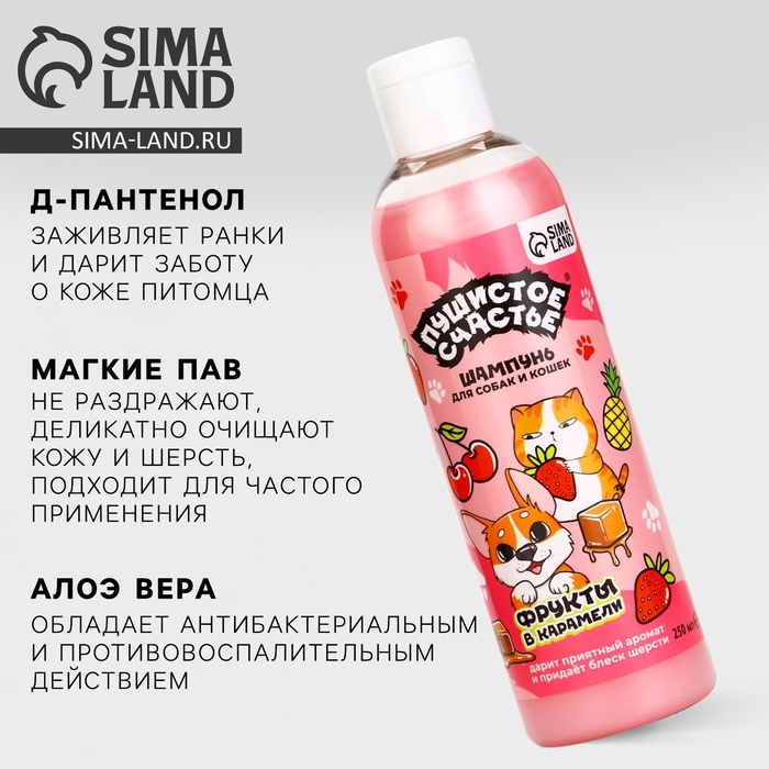 Шампунь предназначен для животных с любым типом шерсти. Специально разработанный шампунь бережно очищает от загрязнений и неприятных запахов, глубоко увлажняет кожу и питает шерсть.