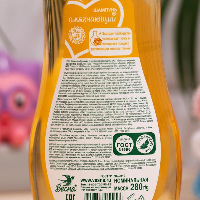 Шампунь детский с экстрактом календулы разработан для мягкого бережного очищения волос и кожи головы малышей с первых дней жизни. Шампунь прозрачного янтарного цвета с нежным травянистым ароматом, образует душистую пену, легко смывается, оставляя волосы легкими и пушистыми. Мягкая гипоаллергенная формула шампуня не содержит вредных отдушек и пенообразователей, не раздражает глазки при случайном попадании и обеспечивает комфортное купание и легкое расчесывание. Экстракт календулы в составе шампуня витаминизирует кожу головы, устраняет раздражения и зуд, заживляет воспаления, предотвращает появление перхоти. Ухаживающие компоненты детского шампуня способствует питанию локонов, росту здоровых, густых волос. Гипоаллергенный состав шампуня с экстрактом календулы идеально подходит для взрослых с чувствительной, склонной к аллергии кожей. Детский шампунь дарит уход и бережное очищение, сделает процедуру купания легкой и приятной.