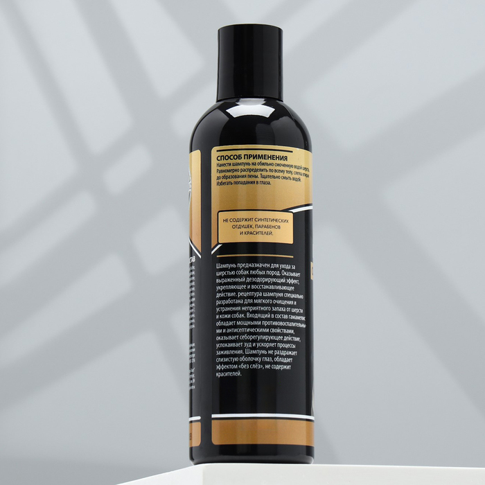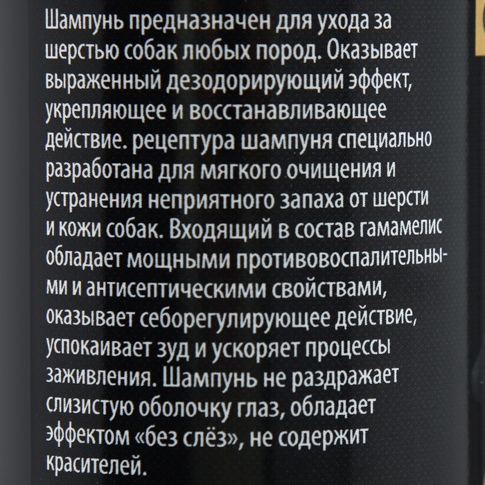 Оказывает выраженный дезодорирующий эффект, укрепляющее и восстанавливающее действие. Рецептура шампуня специально разработана для мягкого очищения и устранения неприятного запаха от шерсти и кожи собак.