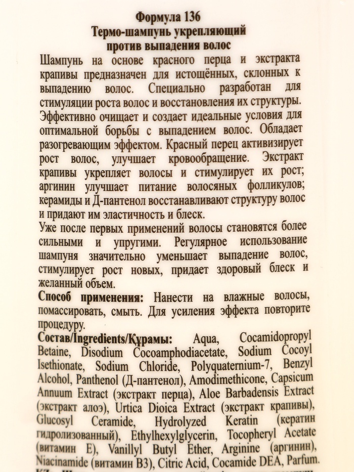 Aqua, Cocamidopropyl Betaine, Disodium Cocoamphodiacetate, Sodium Cocoyl Isethionate, Sodium Chloride, Polyquaternium-7, Benzyl Alcohol, Panthenol (Д-пантенол), Amodimethicone, Capsicum Annuum Extract (экстракт перца), Aloe Barbadensis Extract (экстракт алоэ), Urtica Dioica Extract (экстракт крапивы), Glucosyl Ceramide, Hydrolyzed Keratin (кератин гидролизованный), Ethylhexylglycerin, Tocopheryl Acetate (витамин Е), Vanillyl Butyl Ether, Arginine (аргинин), Niacinamide (витамин В3), Citric Acid, Cocamide DEA, Parfum.